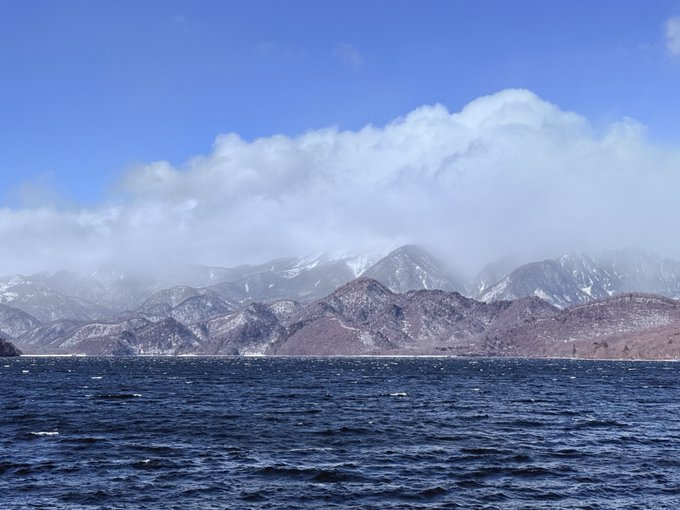 中禅寺湖の向こう側、午前中に登ってた日光白根山方面は雪雲の中。