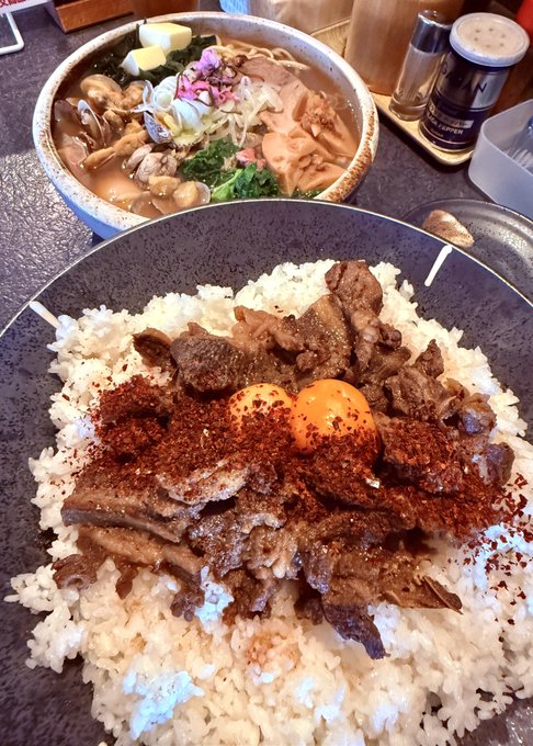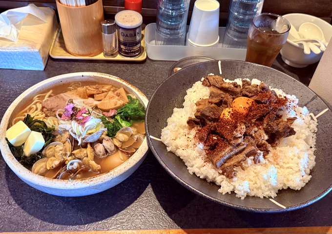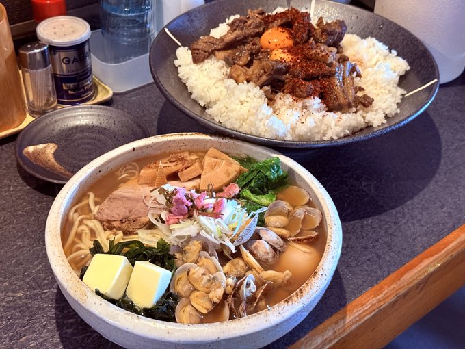 あさりラーメンに桜肉丼。
