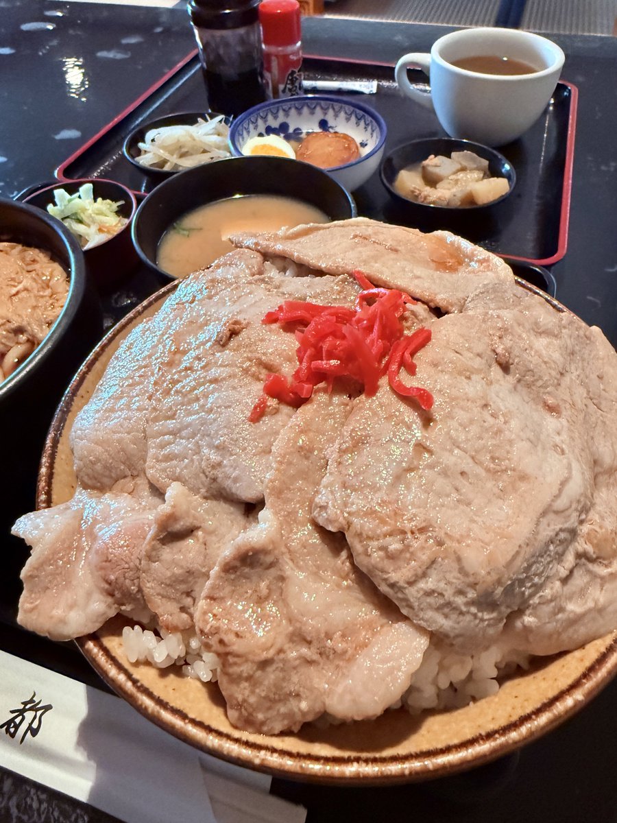 ふんわり優しい玉子が絡むうどんは、心まで温まる美味しさ。 そして生姜焼き丼、これでもか!ってくらいお肉がご飯の上に山盛り!…だけど、ご飯のボリュームもなかなかすごい!🤣 お通し小鉢やうどんの出汁でうまく調整しつつ完食に向けて突き進む!