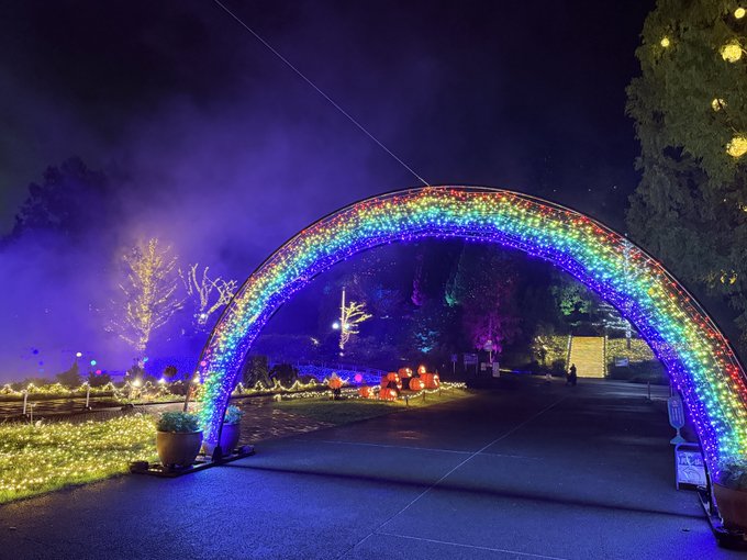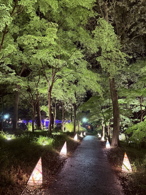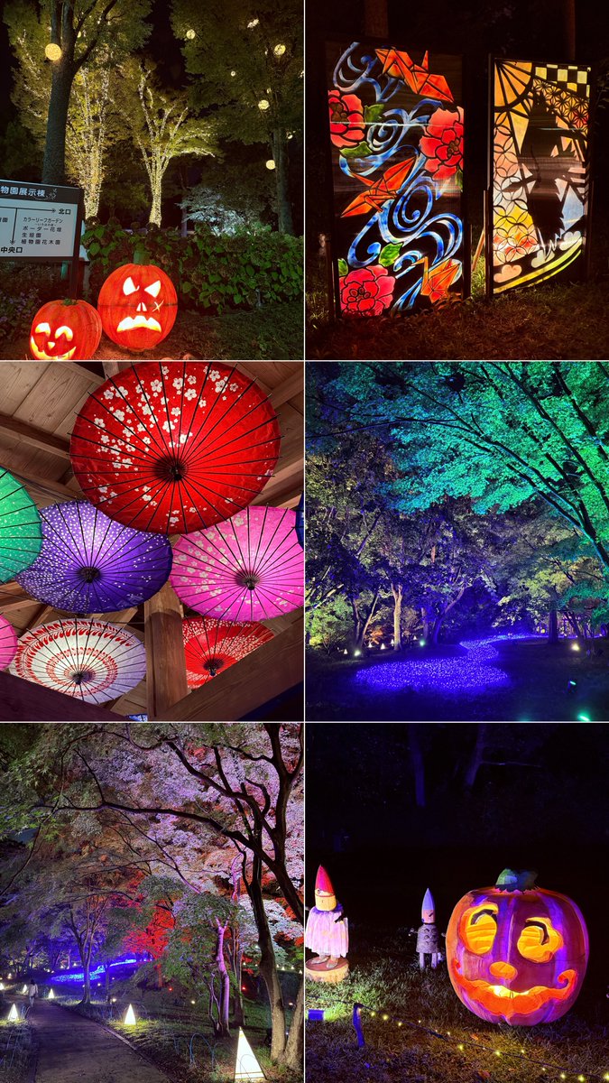 今日からスタートの森林公園のハロウィンナイト🎃。雨上がりの路面に反射する光や、ジャック・オー・ランタンの幻想的な森、カエデ園の森の湖