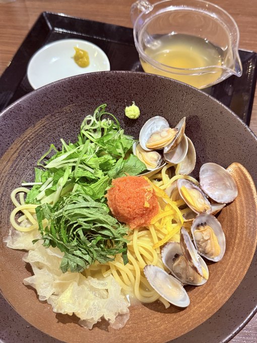 まるで昆布水つけそばのスパゲティ版! まずはそのまま、次にわさびやゆず胡椒、最後は出汁で味変。 スパゲティの新しい楽しみ方発見💡
