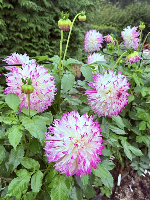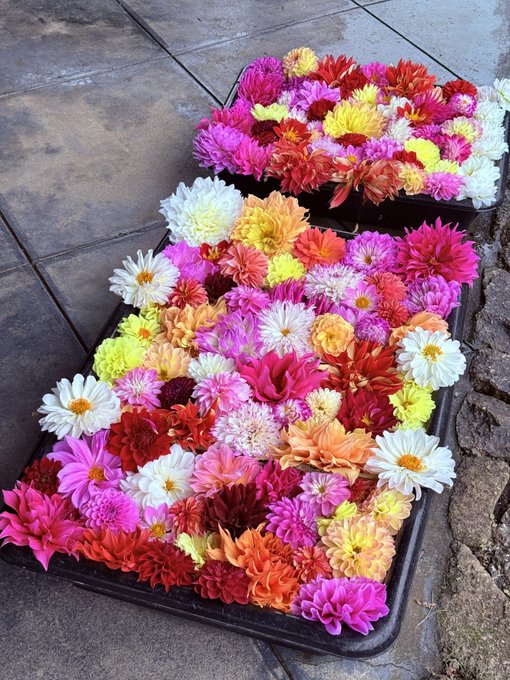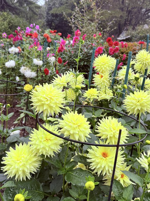薔薇のように色も形もさまざまなダリアが咲き誇り、まんまるボンボンのような可愛らしさ😊