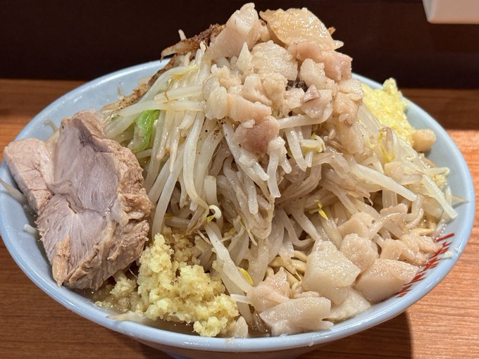 いわゆる“二郎系”で、ぷるぷるの背脂がヤサイの山にどっさり降り注ぐビジュアル😍