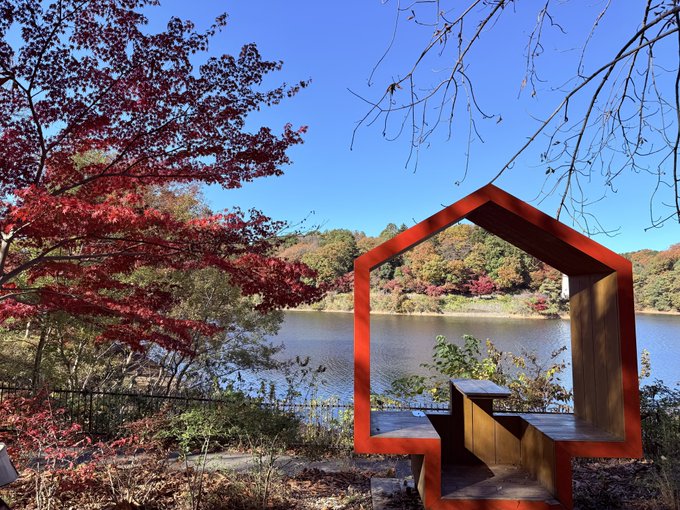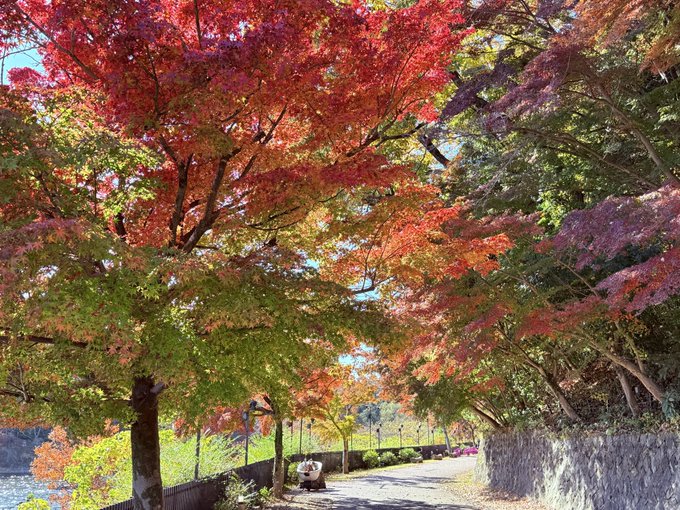 ムーミンバレーパークへ続く湖畔の散策路。もみじが真っ赤に染まっててまさに見頃感来てますね!