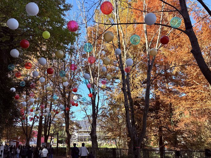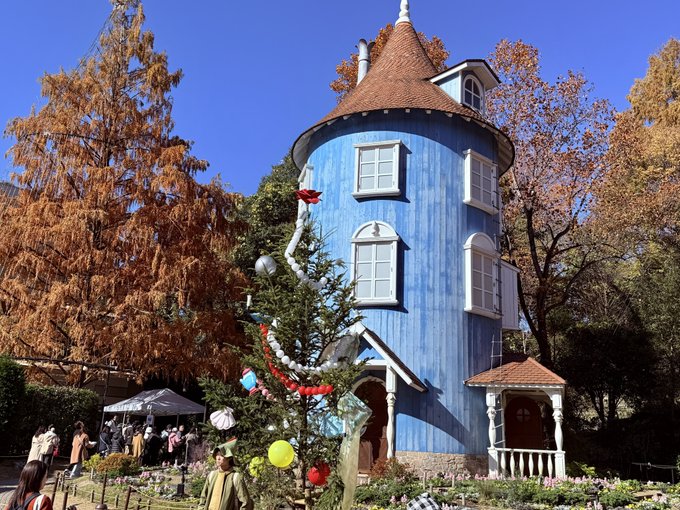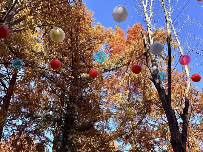 エントランスからムーミン谷エリアへ続く並木道では、 紅葉を背景にカラフルなバルーンスカイが頭上いっぱいに広がって、 秋と冬が同時にやってきたような景色🎄✨