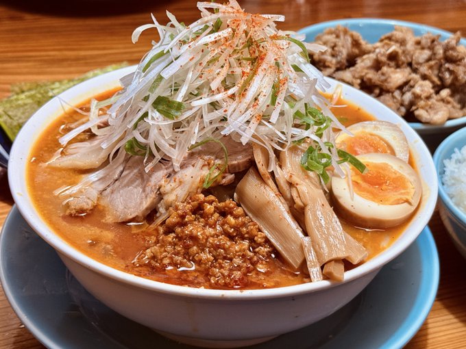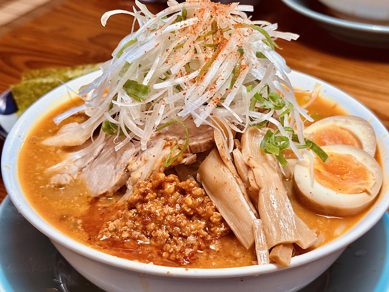 さらに白ネギと青ネギ、味玉、メンマ、ピリ辛ミンチも添えられて、見た目も食べ応えも十分なボリューム感!