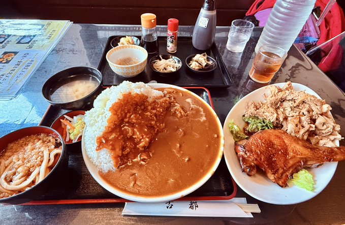 2025/12/20 うどんそば古都「ハヤシライスとチキンレッグと焼肉のセット」-埼玉県入間市